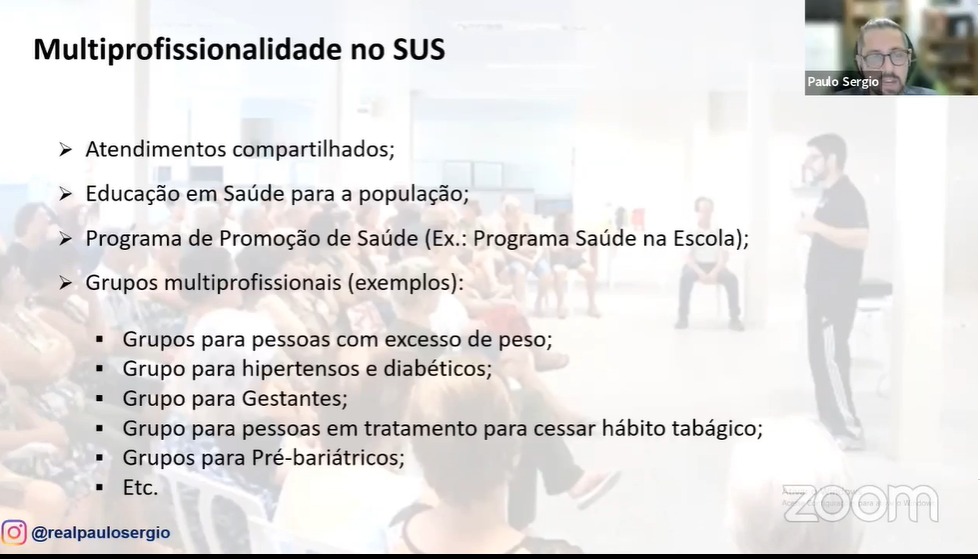 O profissional de Educação FÃsica Paulo Sergio Cardoso da Silva (CREF3-SC) fez uma apresentação sobre a sua área e a atuação no Sistema Único de Saúde, que possibilita tornar mais acessÃvel as atividades à população. “A atividade fÃsica diminui o estresse, melhora o sono, é fator de proteção para várias doenças crônicas e ajuda até mesmo na inclusão social”, disse ele. Paulo Sergio foi responsável pela implantação do Núcleo Ampliado de Saúde da FamÃlia e Atenção Básica (NASF-AB) no municÃpio de São José, coordenando o serviço e chegando à posição de Diretor da Vigilância Epidemiológica neste municÃpio. Autor de livros e palestrante, possui Mestrado e Doutorado em Saúde Coletiva com ênfase em Epidemiologia (UFSC), atualmente é docente na UDESC, estando Coordenador do GT de PolÃticas Públicas da Sociedade Brasileira de Atividade FÃsica e Saúde.