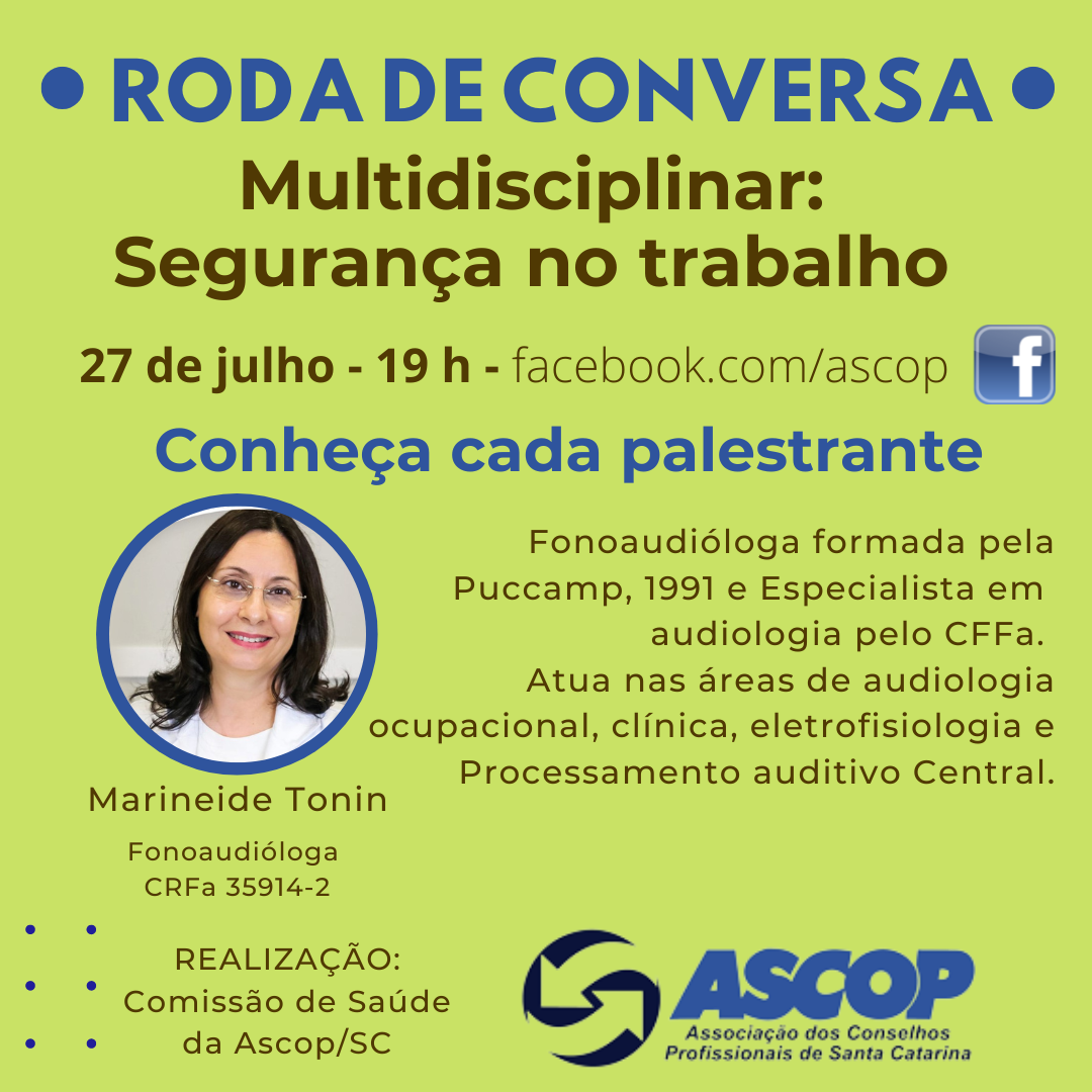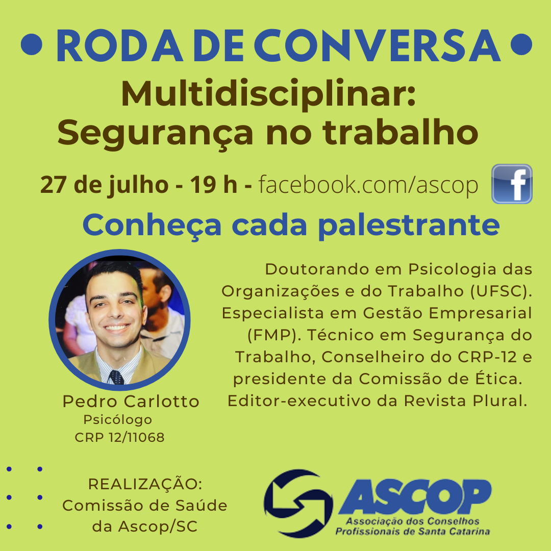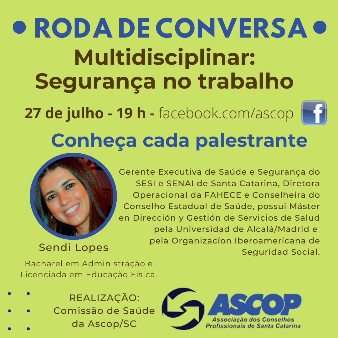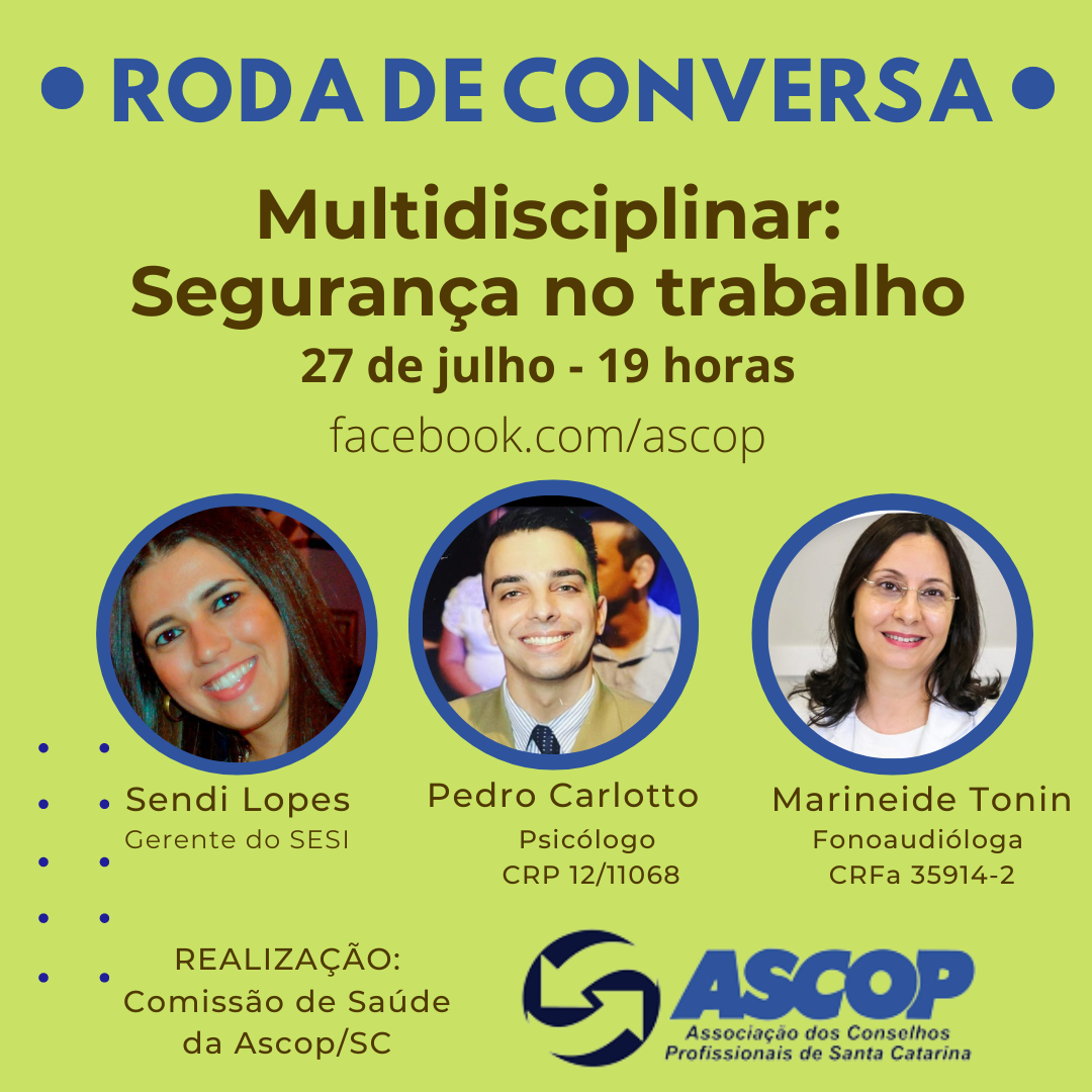 A Comissão de Saúde da Ascop/SC promove amanhã, dia 27 de julho, mais um evento virtual para debater assuntos de interesse de várias profissões. A Roda de Conversa “Multidisciplinar: Segurança no Trabalho” será transmitida pelo Facebook da Ascop a partir das 19h e terá a participação de três palestrantes.