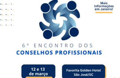 A Associação dos Conselhos Profissionais de Santa Catarina (ASCOP/SC) realiza, nos dias 12 e 13 de março de 2026, o 6º Encontro Nacional dos Conselhos Profissionais, no Golden Hotel & Eventos, em São José (SC).
